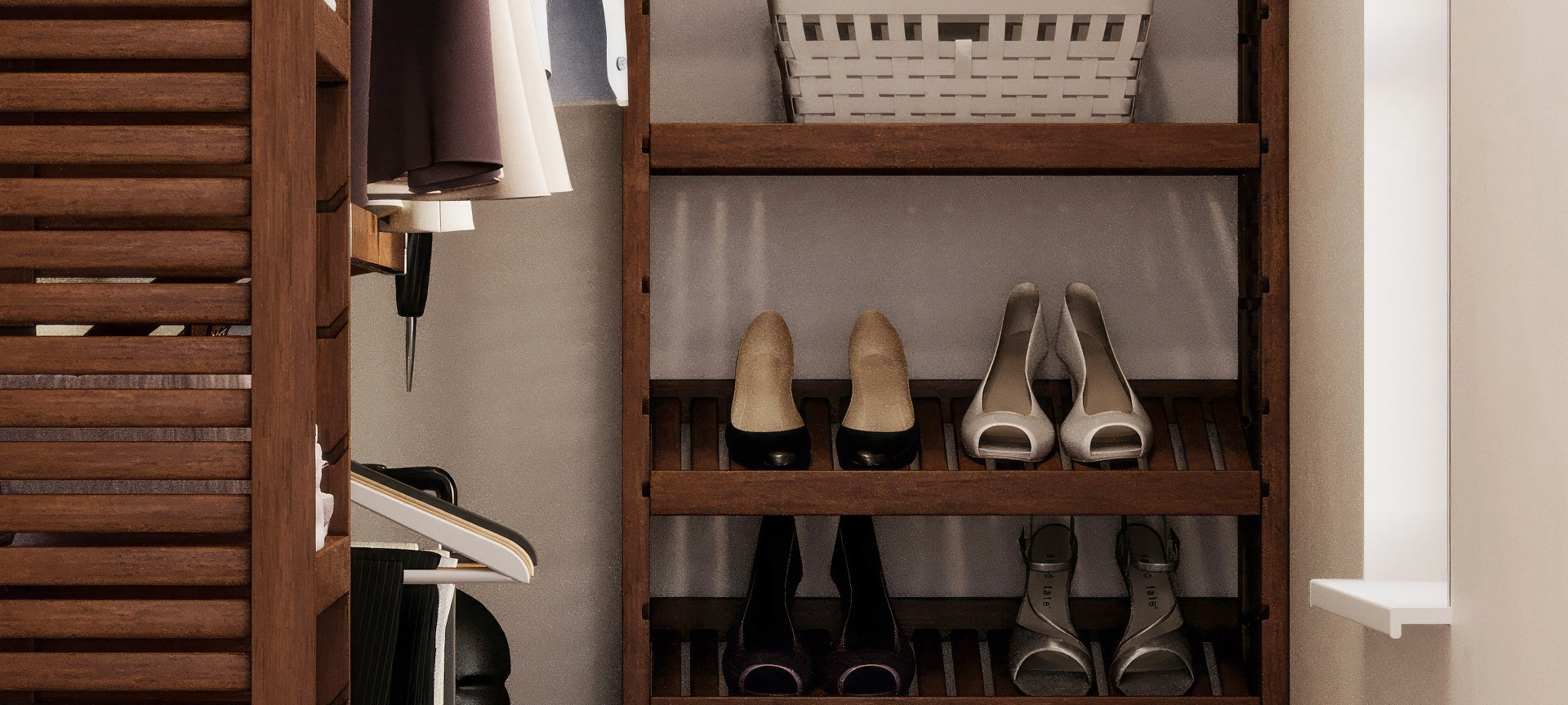 It's easy to create shoe shelves. Simply flip them upside down and at an angle to create the ultimate shoe organizer.