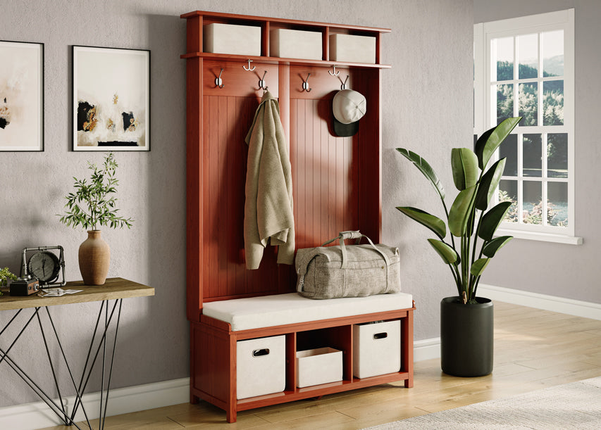 The comfortable cushioned bench provides a perfect spot to put on footwear, which you can then neatly store in the compartments below. Organize gloves, hats, and more in the convenient storage bin or on the upper shelves, giving you powerful customization and functionality. Crafted from 100% solid wood, this durable entry organizer ensures long-term durability, allowing you to create an aspirational and effortlessly organized space.